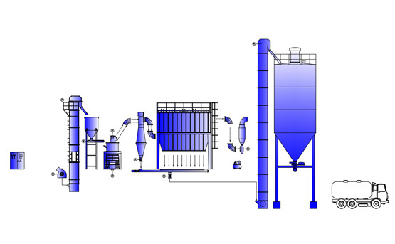 4、集粉階段:符合細(xì)度的粉子隨氣流經(jīng)管道進(jìn)入集粉系統(tǒng),氣粉分離,成品粉由輸送裝置送至成品料倉,再統(tǒng)一用裝粉罐車或者自動(dòng)打包機(jī)進(jìn)行包裝。