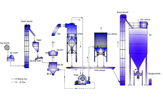 2、磨粉階段:滿足入磨條件的小塊物料經(jīng)輸送給料系統(tǒng)均勻定量的進(jìn)入磨機(jī)研磨室,在磨腔內(nèi)研磨成粉。