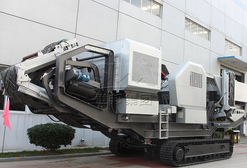 世邦集團(tuán)履帶式移動(dòng)破碎站由履帶底盤、車架總成、主機(jī)及輔助設(shè)備、動(dòng)力系統(tǒng)和液壓電控系統(tǒng)組成。移動(dòng)時(shí),通過(guò)動(dòng)力系統(tǒng)提供動(dòng)力,由液壓電控系統(tǒng)控制驅(qū)動(dòng)履帶底盤行走;安裝時(shí),動(dòng)力系統(tǒng)通過(guò)液壓電控系統(tǒng)控制驅(qū)動(dòng)液壓缸等動(dòng)作,自動(dòng)完成設(shè)備安裝;工作時(shí),動(dòng)力系統(tǒng)通過(guò)液壓電控系統(tǒng)驅(qū)動(dòng)和控制主機(jī)及輔助設(shè)備工作,物料從料倉(cāng)進(jìn)入搭載在履帶底盤和車架上的主機(jī)破碎或篩分后,通過(guò)集成式的皮帶機(jī)排出。