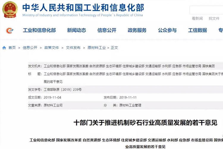 2019年11月11日,工業(yè)和信息化部、國家發(fā)展改革委、自然資源部、生態(tài)環(huán)境部、住房城鄉(xiāng)建設(shè)部、交通運輸部、水利部、應(yīng)急部 、市場監(jiān)管總局和國鐵集團等國家十部門發(fā)布《關(guān)于推進機制砂石行業(yè)高質(zhì)量發(fā)展的若干意見》(以下簡稱《意見》)。