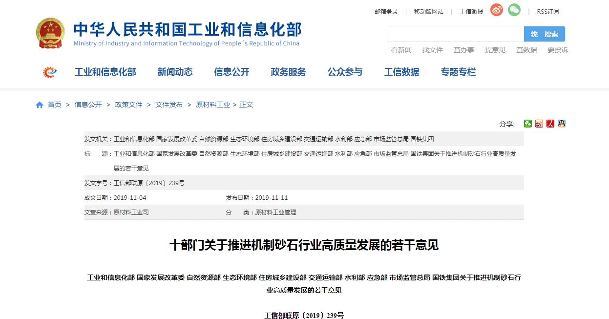 2019年11月11日,工業(yè)和信息化部、國(guó)家發(fā)展改革委、自然資源部、生態(tài)環(huán)境部、住房城鄉(xiāng)建設(shè)部、交通運(yùn)輸部、水利部、應(yīng)急部 、市場(chǎng)監(jiān)管總局和國(guó)鐵集團(tuán)等國(guó)家十部門發(fā)布《關(guān)于推進(jìn)機(jī)制砂石行業(yè)高質(zhì)量發(fā)展的若干意見(jiàn)》。在此之前,已有多省出臺(tái)政策,通過(guò)建立機(jī)制砂生產(chǎn)基地、發(fā)布機(jī)制砂應(yīng)用標(biāo)準(zhǔn)等措施,促進(jìn)機(jī)制砂推廣應(yīng)用。