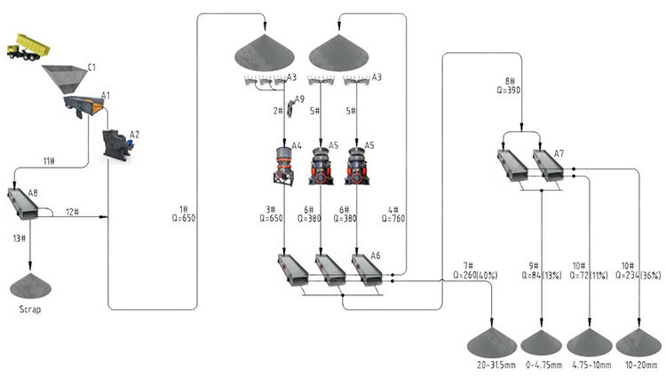 河卵石屬于硬度比較大的石料,在實際破碎過程中,顎板、板錘、反擊襯板等耐磨件的損耗十分的高,后期設(shè)備維護的成本自然也較高。因此,我們對河卵石制砂機生產(chǎn)線的設(shè)計,盡可能的選擇層壓原理的破碎設(shè)備,以減少耐磨件的損耗。針對河卵石的破碎方案,通常采用兩段或三段破碎流程。