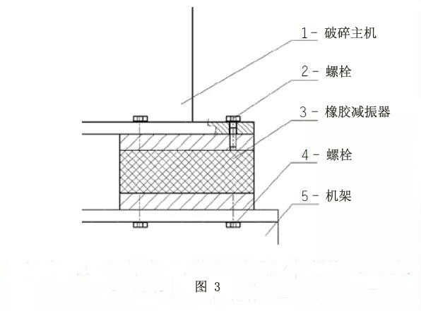剛性連接時(shí),由于破碎主機(jī)與機(jī)架之間沒有緩沖、減振裝置,破碎機(jī)產(chǎn)生的振動(dòng)直接傳遞到機(jī)架上,幾乎沒有緩沖和振動(dòng)抑制,因此機(jī)架與破碎機(jī)結(jié)合處以及與機(jī)架連接的其他部件均受到不同程度的振動(dòng)損傷,使用壽命受到不同程度的影響。因此本方案不適合沖擊較大的破碎機(jī),如顎式破碎機(jī)和圓錐式破碎機(jī)。但其結(jié)構(gòu)形式簡(jiǎn)單、成本低等優(yōu)點(diǎn)特別明顯,在沖擊不大的反擊式破碎機(jī)應(yīng)用較多,但此時(shí)要注意機(jī)架結(jié)構(gòu)局部加強(qiáng),防止機(jī)架疲勞斷裂。