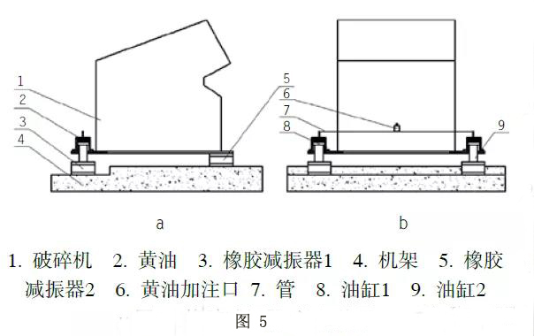 如圖5所示,油缸8、油缸9的缸筒與破碎機(jī)連接,油缸活塞桿與減振器3上側(cè)鋼板連接,減振器3和減振器5下側(cè)鋼板與機(jī)架4連接,減振器5上側(cè)鋼板與破碎機(jī)1連接,油缸8和油缸9的無(wú)桿腔通過油管7聯(lián)通,兩油缸無(wú)桿腔內(nèi)通過黃油加注口6加注黃油,因?yàn)閮汕宦?lián)通,因此兩無(wú)桿腔壓力始終相等。