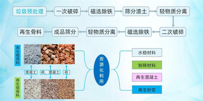 2 環(huán)保智能生產(chǎn)工藝,通過分揀、破碎、篩分、磁選、分離、整形等工藝,產(chǎn)出成品料可用作再生骨料、拌和混凝土及制成再生磚,實現(xiàn)變廢為寶