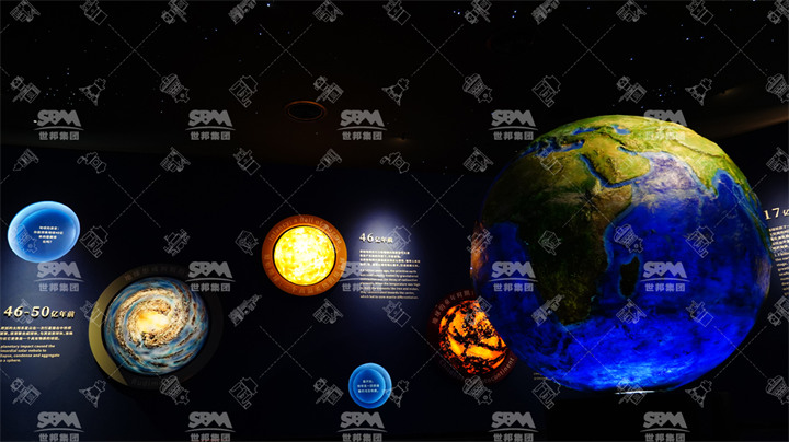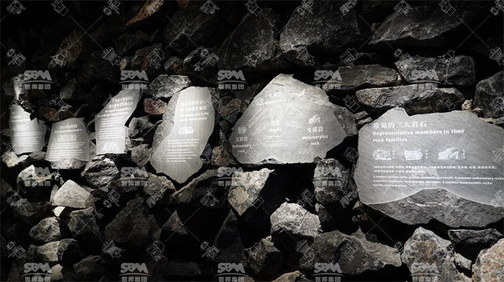 推門而入,映入眼簾的便是利用3D打印技術(shù)造的小型宇宙,還原了宇宙50億年的滄桑巨變。同樣結(jié)合3D打印技術(shù),我們制作了一個仿真地球,較大程度還原了地球表層的地質(zhì)地貌。在巖石的分類區(qū),您可以看到由1815塊石頭砌成的礦洞,這些石頭均來自世邦自有石料礦,包含火成巖、沉積巖、變質(zhì)巖。