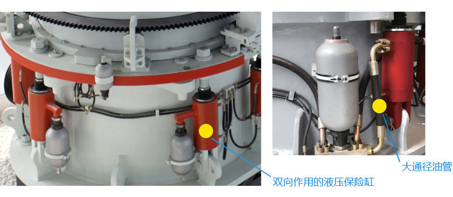 HP系列圓錐破配備了全自動(dòng)液壓保險(xiǎn)系統(tǒng)且保險(xiǎn)缸油路采取大通徑油管、大容量蓄能器,緩沖性能非常好。因此,當(dāng)破碎機(jī)遇到鐵塊等非破碎物料時(shí),能夠快速做出反應(yīng),實(shí)現(xiàn)自動(dòng)排除雜物的功能,保障設(shè)備安全。