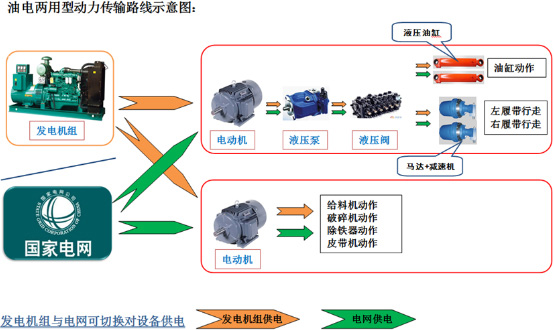 履帶移動(dòng)站的動(dòng)力系統(tǒng)采用了油—電雙驅(qū)理念,用戶可以根據(jù)礦區(qū)實(shí)際情況選擇柴油發(fā)電機(jī)驅(qū)動(dòng),或者直接采用當(dāng)?shù)仉娋W(wǎng),徹底解決部分地區(qū)偏遠(yuǎn)地區(qū)設(shè)備用電難題,亦可以滿足部分用戶節(jié)省燃料費(fèi)用的需求。