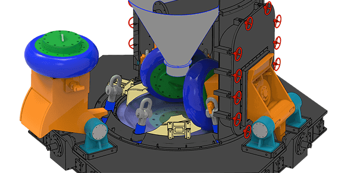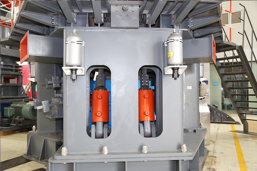 該機設計過程中我們充分考慮重型磨輥可能帶來的養(yǎng)護難題,最終開發(fā)設計了可翻轉(zhuǎn)結(jié)構(gòu)。該結(jié)構(gòu)配合液壓調(diào)整系統(tǒng),操作員可輕松、快捷的將磨輥翻出機殼外部進行檢修,更換輥套、襯板等養(yǎng)護操作,減少停機損失。