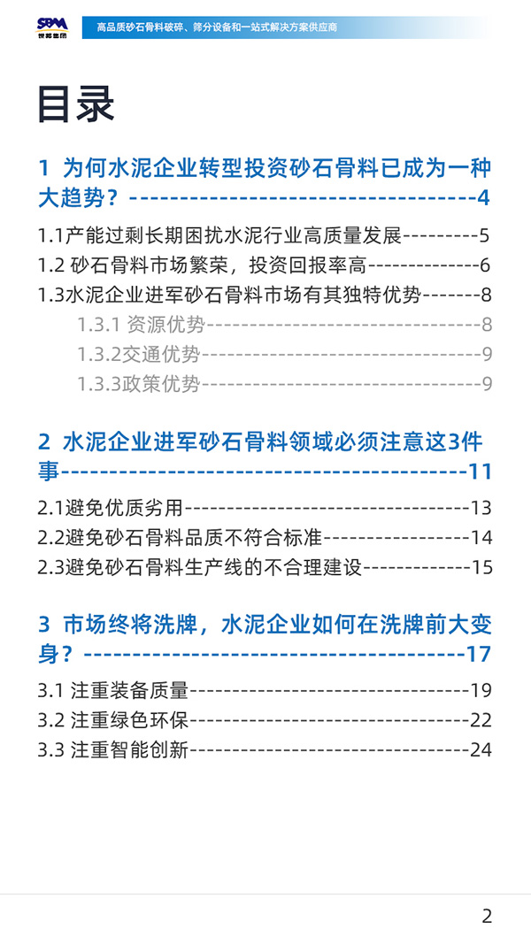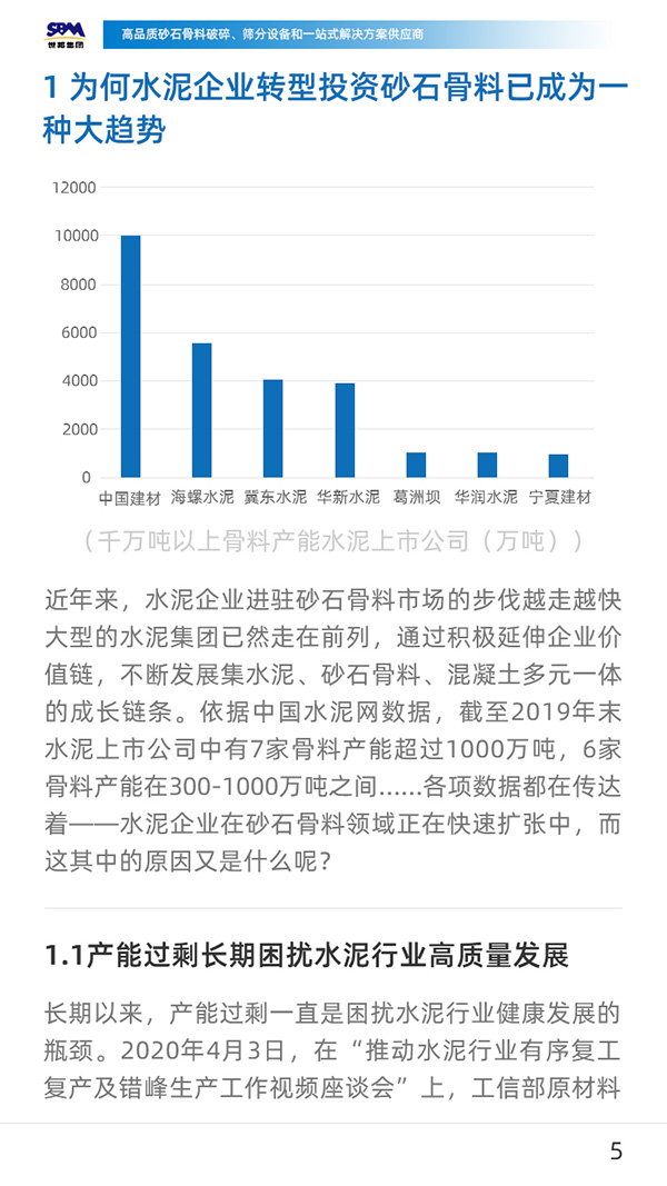 世邦集團(tuán)手機(jī)站近年來,水泥企業(yè)通過積極延伸企業(yè)價(jià)值鏈,不斷發(fā)展集水泥、砂石骨料、混凝土多元一體的成長(zhǎng)鏈條。水泥企業(yè)在砂石骨料領(lǐng)域正在快速擴(kuò)張中,而這其中的原因又是什么呢?水泥企業(yè)又如何順利轉(zhuǎn)型?