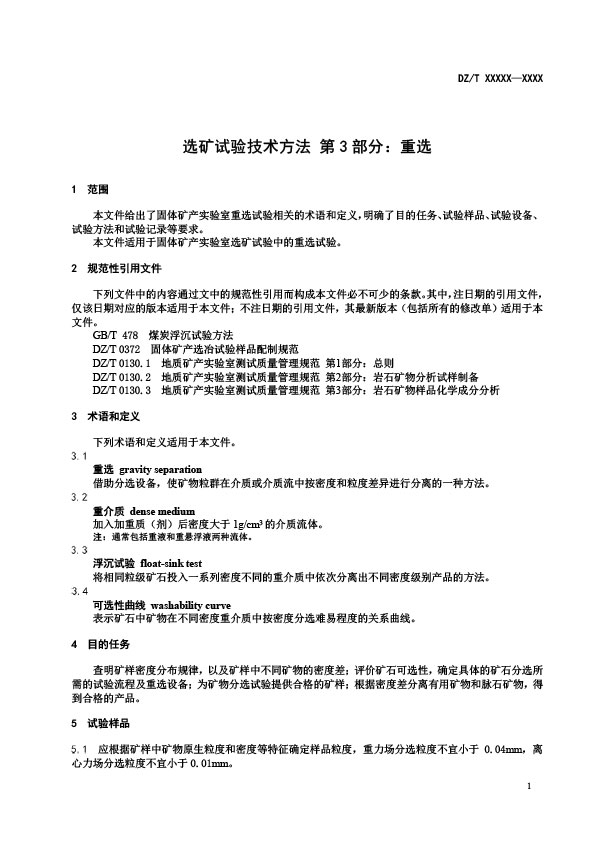 本文件給出了固體礦產(chǎn)實驗室重選試驗相關(guān)的術(shù)語和定義,明確了目的任務(wù)、試驗樣品、試驗設(shè)備,試驗方法和試驗記錄等要求。本文件適用于固體礦產(chǎn)實驗室選礦試驗中的重選試驗。