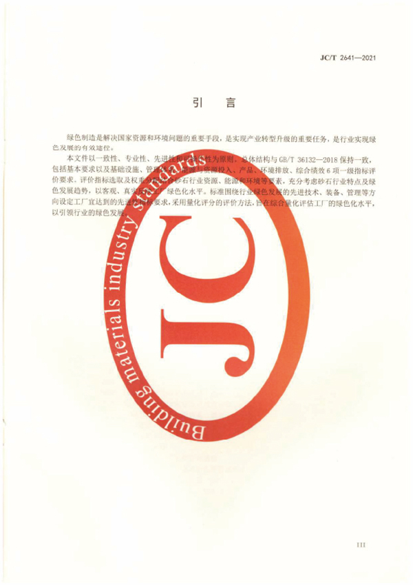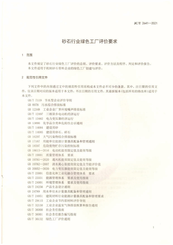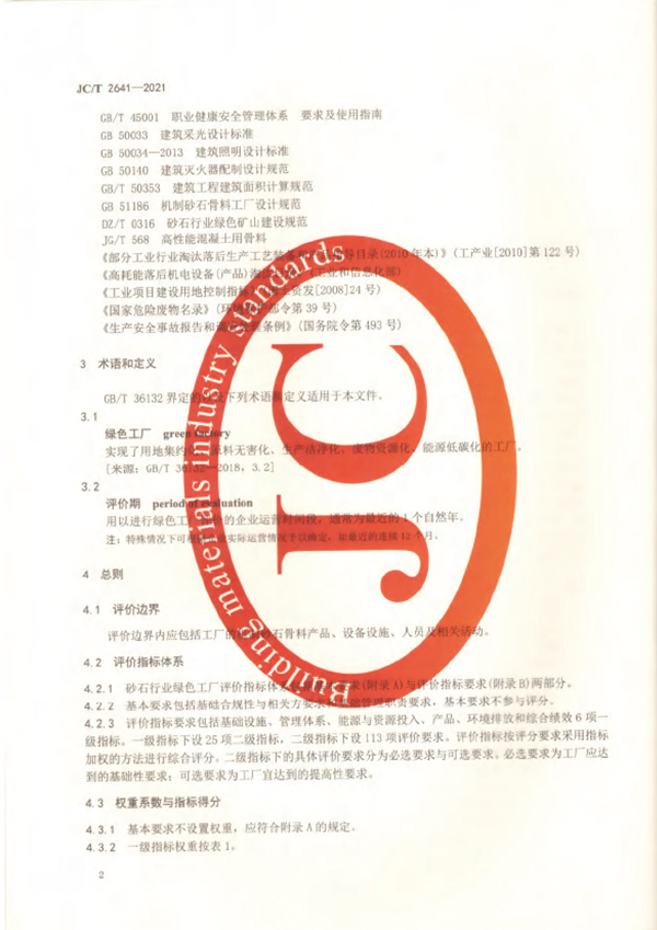 本標(biāo)準(zhǔn)根據(jù)砂石行業(yè)特點(diǎn)及綠色發(fā)展趨勢(shì),以節(jié)能、減排、綠色、低碳為核心,圍繞行業(yè)先進(jìn)技術(shù)、裝備、管理等方向,制定了綜合全面的砂石行業(yè)綠色工廠評(píng)價(jià)指標(biāo)體系,適用于機(jī)制砂石骨料企業(yè)的綠色工廠創(chuàng)建與評(píng)價(jià)。